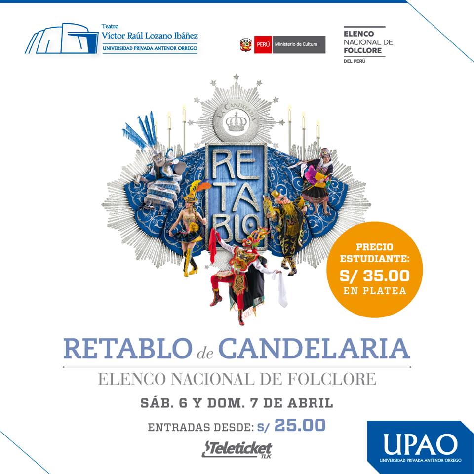 Este sábado 6 y domingo 7 de abril, el Elenco Nacional de Folclore del Perú regresa por segunda vez a Trujillo con su espectacular Retablo de Candelaria para presentarse en dos únicas funciones en el Teatro Víctor Raúl Lozano Ibáñez de la Universidad Privada Antenor Orrego.