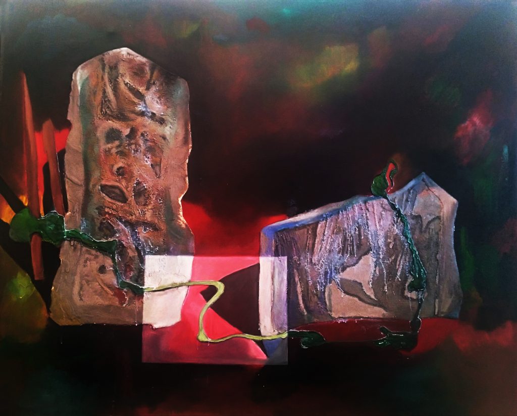 Conformada por óleos de gran formato y trabajos en papel en técnica mixta, nos muestra cómo lo andino y su poder telúrico se cuela, en los cerros de Lima