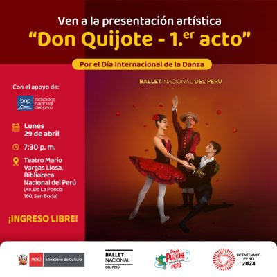 Se presentará el primer Acto "Don Quijote", a cargo del Ballet Nacional del Perú, bajo la dirección de la maestra Grace Cobián en el Teatro “Mario Vargas Llosa” de la Biblioteca Nacional del Perú (BNP) a las 7:30 p.m. El ingreso es libre y por orden de llegada.