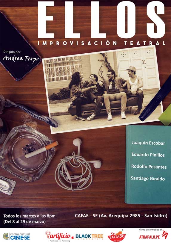 El actor y ahora improvisador Joaquín Escobar vuelve a escena con un nuevo espectáculo de improvisación teatral dirigido por Andrea Ferpo: “Ellos” que cuenta con la participación de los improvisadores Eduardo Pinillos, Rodolfo Pesantes y Santiago Giraldo, representantes en el último festival de Impro Chaskij Fest 2015, se presentará desde el 8 de marzo a las 8:00 pm en el Centro Cultural CAFAE-SE de San Isidro (Av. Arequipa 2985)