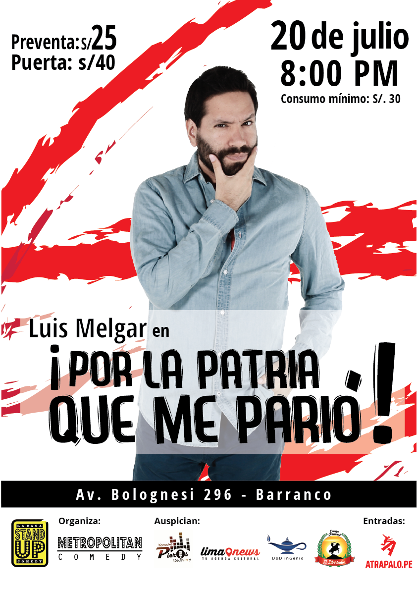 El unipersonal de Luis Melgar se presentará en La Casa del Stand Up Comedy de Barranco con lo mejor de su material, este viernes 20 de julio a las 8.00 p. m. Las entradas están a la venta en Atrápalo.pe, en el Fan Page de Metropolitan Comedy y en el mismo local el día del espectáculo.