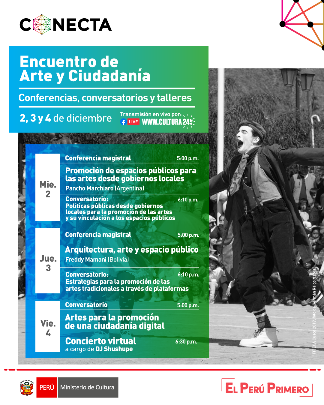 En el marco del programa Conecta 2020 del Ministerio de Cultura, se presentó el Encuentro de Arte y Ciudadanía, que buscó generar un espacio de diálogo y reflexión en el contexto actual donde las dinámicas de confinamiento nos invitan a repensar la producción artística, el espacio público y el ejercicio ciudadano.