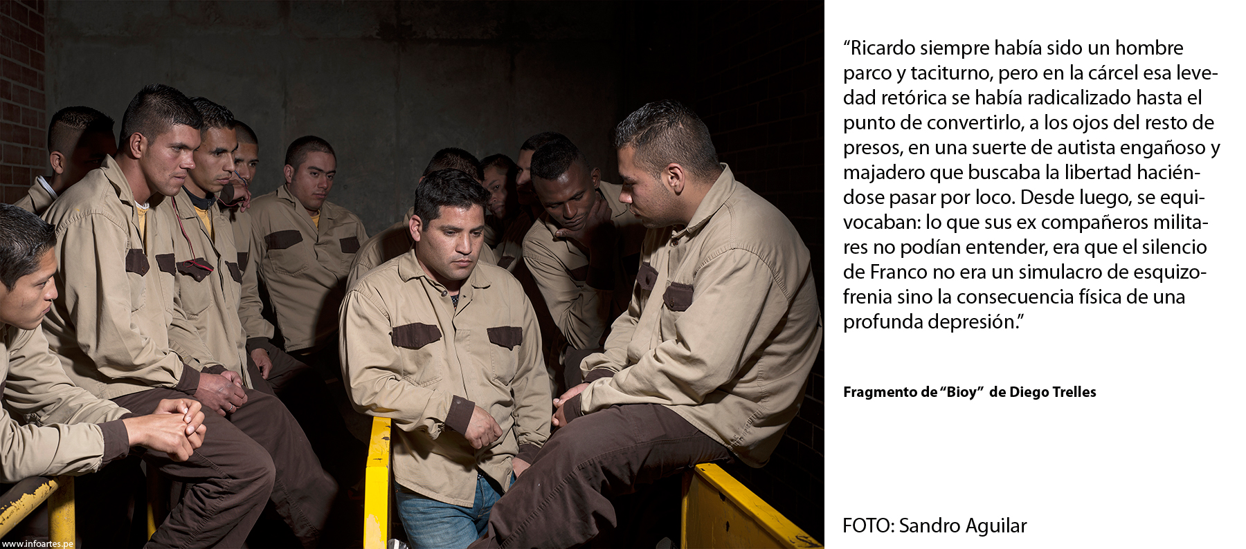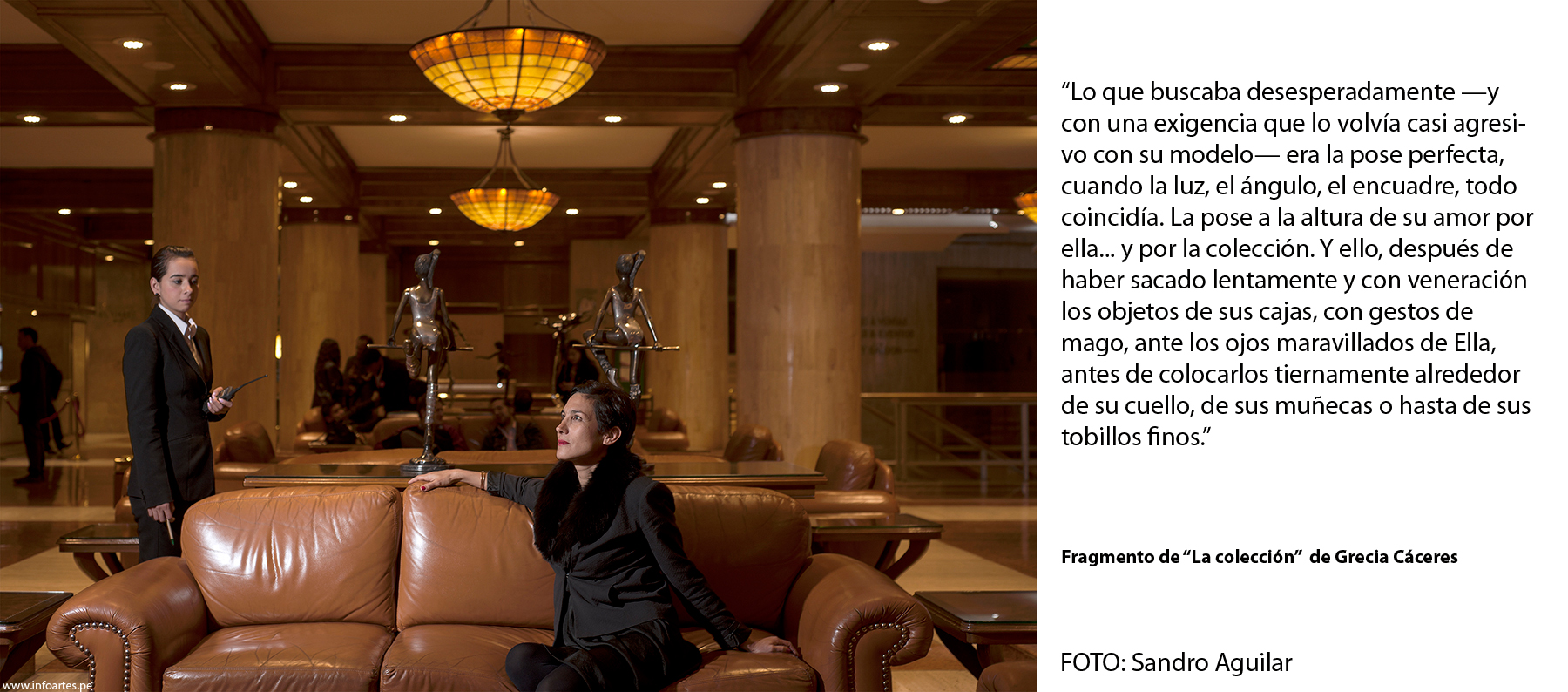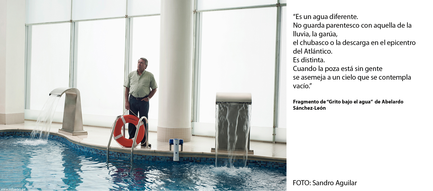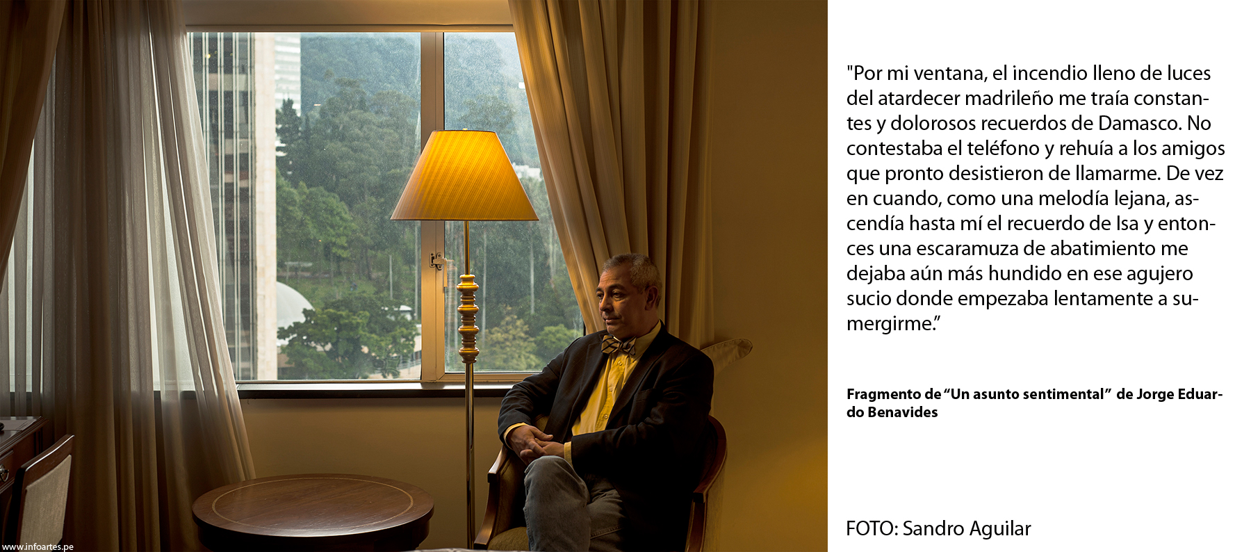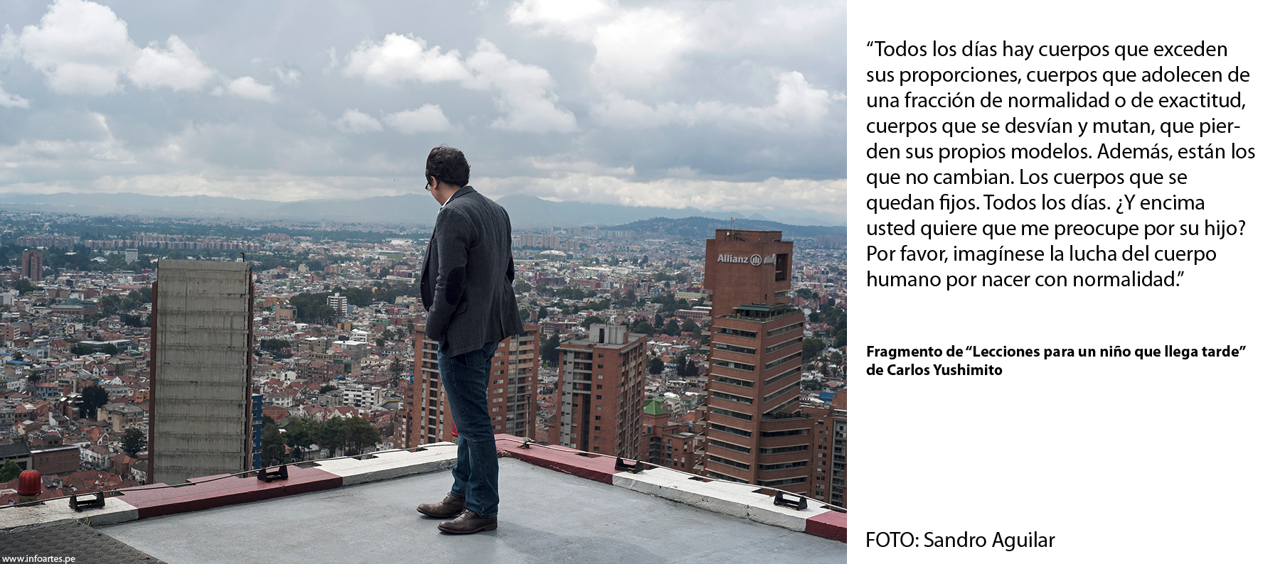 Este trabajo se realizó entre las múltiples actividades que los escritores cumplieron en Bogotá, por acierto pero sobre todo por mucha intuición y aventura, ya que les agradezco que hayan puesto tan buena disposición para mis pedidos disparatados. A Carlos Yushimito, por ejemplo, lo llevé al helipuerto del hotel Tequendama a sabiendas de su connotado vértigo. A Diego Trelles lo convertí en presidiario de un pabellón en la Cárcel Distrital de Bogotá. A Abelardo Sánchez-León, conocido también como nadador, lo convertí en un ocasional salvavidas de una piscina (recuerdo que nos echaron pronto porque una pareja reclamó su intimidad a los besos). A Gabriela Wiener la hice dormir porque estaba cansada y me hacía muchas preguntas. A Raúl Tola y Grecia Cáceres los puse en observación de dos vigilantes para darles un contrapunto suspicaz, o solo ajeno, y es que eso documentaría también a una ciudad que sugiere cuidado. A Alejando Neyra lo fotografié en Lima porque no encajamos en Bogotá, a pesar de ya tener la idea hecha durante un almuerzo de la Feria. Me pregunto qué hubiese sido de esa foto con los muchachos militares que una noche nos pidieron cigarrillos a Dante Trujillo y a mí. A Oswaldo Reynoso lo encontré antes de que vuelva a Lima pero no quería salir del hotel, así que el vestíbulo lo envió quieto a la Amazonía virgen. Puedo decir, sin duda, que ellos fueron sus mejores actores, y me enseñaron mucho aquellos inolvidables días. ¡Feliz día internacional del libro 2015!