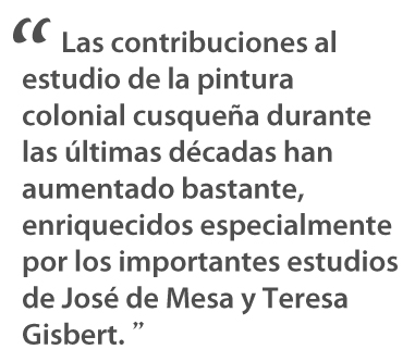 También hubo un fuerte interés en el arte colonial andino durante las décadas 40 y 50 entre los estadounidenses, con las importantes publicaciones de George Kubler y Martín Soria, Pál Kelemen, y Harold Wethey. Las contribuciones al estudio de la pintura colonial cusqueña durante las últimas décadas han aumentado bastante, enriquecidos especialmente por los importantes estudios de José de Mesa y Teresa Gisbert. Su Historia de la pintura cuzqueña, publicado inicialmente en 1962, con una segunda edición revisada en 1982, permanece como el estudio más importante y abonado sobre la pintura colonial de la región cusqueña. Hay muchos más autores que forman parte de esta historiografía que no se puede mencionar aquí por cuestiones de espacio, pero que se encuentran en la bibliografía de nuestro libro.