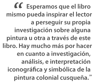 Este libro se inspiró a través de muchas conversaciones con Raúl sobre el arte colonial y las oportunidades que existen para difundir esta rica tradición artística a una audiencia diversa, compuesta no solamente de académicos sino del público en general. La realidad es que pocos libros existen sobre el arte colonial con una fina atención a estos dos tipos de lectores, y aún menos que están sustancialmente ilustrados para facilitar un análisis y comparaciones visuales entre diferentes pinturas. Por eso, este libro sirve principalmente como un recurso complementario a los numerosos estudios valiosos ya existentes sobre la pintura colonial cusqueña. Creo que su mayor contribución reside en la diversidad y la gran cantidad de las pinturas incluidas, algunas nunca antes publicadas y otras que solo están reproducidas en libros antiguos, en su mayoría con una reducida calidad fotográfica y en blanco y negro. Esperamos que el libro mismo pueda inspirar el lector a perseguir su propia investigación sobre alguna pintura u otra a través de este libro. Hay mucho más por hacer en cuanto a investigación, análisis, e interpretación iconográfica y simbólica de la pintura colonial cusqueña. Las nuevas generaciones de estudiantes y amantes del arte son claves para continuar esta el valioso trabajo de profundizar nuestro entendimiento sobre la historia del arte andino.