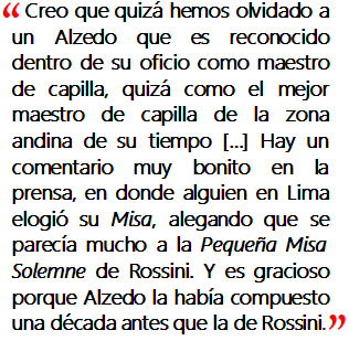 Creo que quizá hemos olvidado a un Alzedo que es reconocido dentro de su oficio como maestro de capilla, quizá como el mejor maestro de capilla de la zona andina de su tiempo; un tipo que realmente lograba expresar lo que se necesitaba religiosamente en su música, y lo hacía a un modo que la gente apreciaba y admiraba mucho. Hay un comentario muy bonito en la prensa, en donde alguien en Lima elogió su Misa, alegando que se parecía mucho a la Pequeña Misa Solemne de Rossini. Y es gracioso porque Alzedo la había compuesto una década antes que la de Rossini.