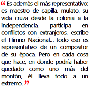 Es además el más representativo: es maestro de capilla, mulato, su vida cruza desde la colonia a la independencia, participa en conflictos con extranjeros, escribe el Himno Nacional… todo eso es representativo de un compositor de su época. Pero en cada cosa que hace, en donde podría haber quedado como uno más del montón, él lleva todo a un extremo. Siempre trata de llegar un paso más allá, y se nota que en su obra trabaja con mucha consciencia. Su Filosofía elemental es el texto más importante sobre música de América Latina del siglo XIX. Tiene obras tempranas, sobre todo piezas religiosas breves, que después de su muerte se siguieron haciendo en Perú y en Chile; pero las grandes obras, las que no se han tocado en su mayoría, son composiciones de gran interés tanto instrumental como teológico.