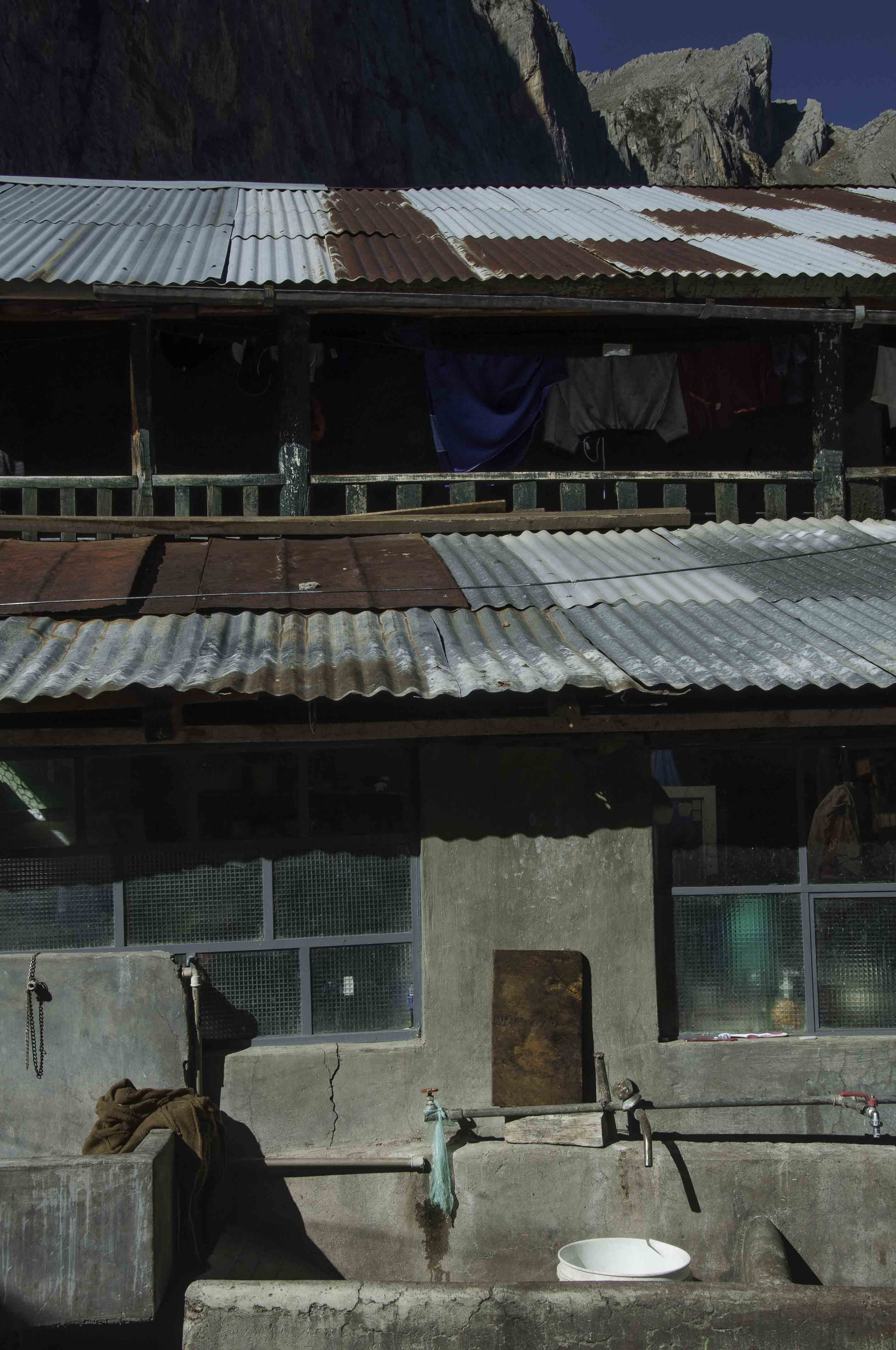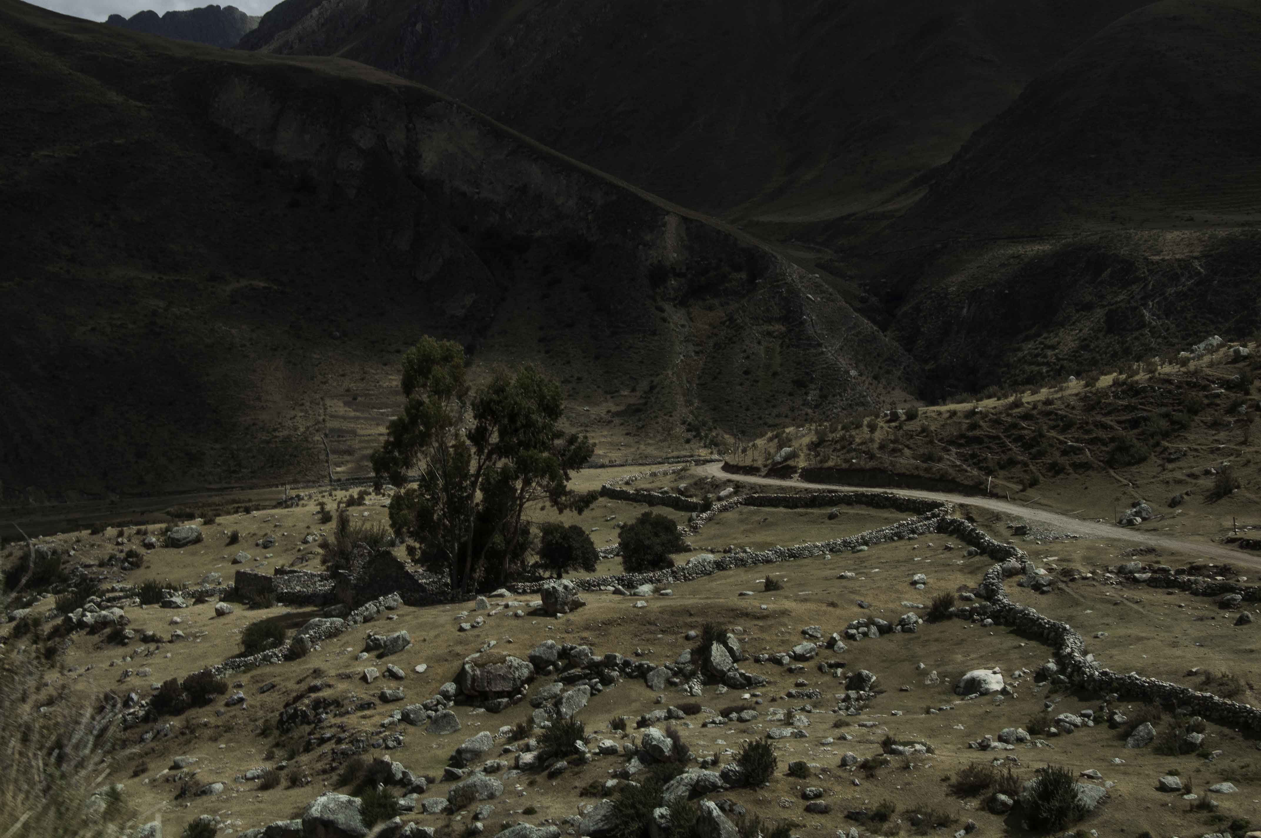 Foto 1. Muestra del origen de las formas de delimitación y construcción humanas. (2015). Lugar: Entre Laraos y Tanta. El hombre signa el suelo, construye un lenguaje de formas comprendidas por los materiales que lo rodean. Reseña: (Primer plano general) Un árbol a la intemperie, circundado por una marisma de piedras. (tercer plano) Una montaña es el principio de lo majestuoso en el hombre. | | Foto 2. La vivienda humana. (2015) Lugar: Tómas. Con el tiempo los materiales cambian, los sistemas se complican. Hay una cierta alquimia en el orden que nos rodea. (Primer Plano) Lavadero del cual dimana el agua que podría bajar de las montañas. Tejados, balcones, ropas, son elementos que relacionan al hombre en con el lugar que habita. (Tercer plano) Cima de montaña | | Foto 3. Paso del agua a través de escalones naturales. (2015) Lugar: Vilca. Reseña: El agua no es silente. En este paisaje mujeres caminan por pequeñas islas formadas debido al flujo del río. | |