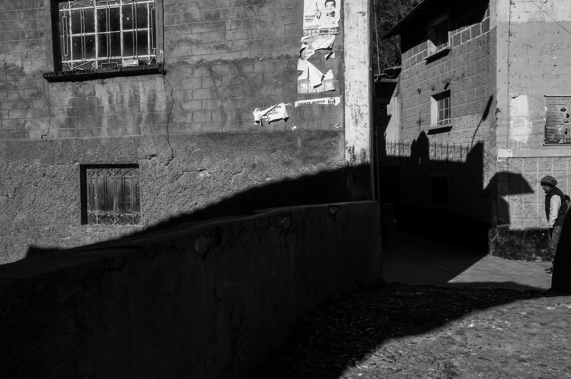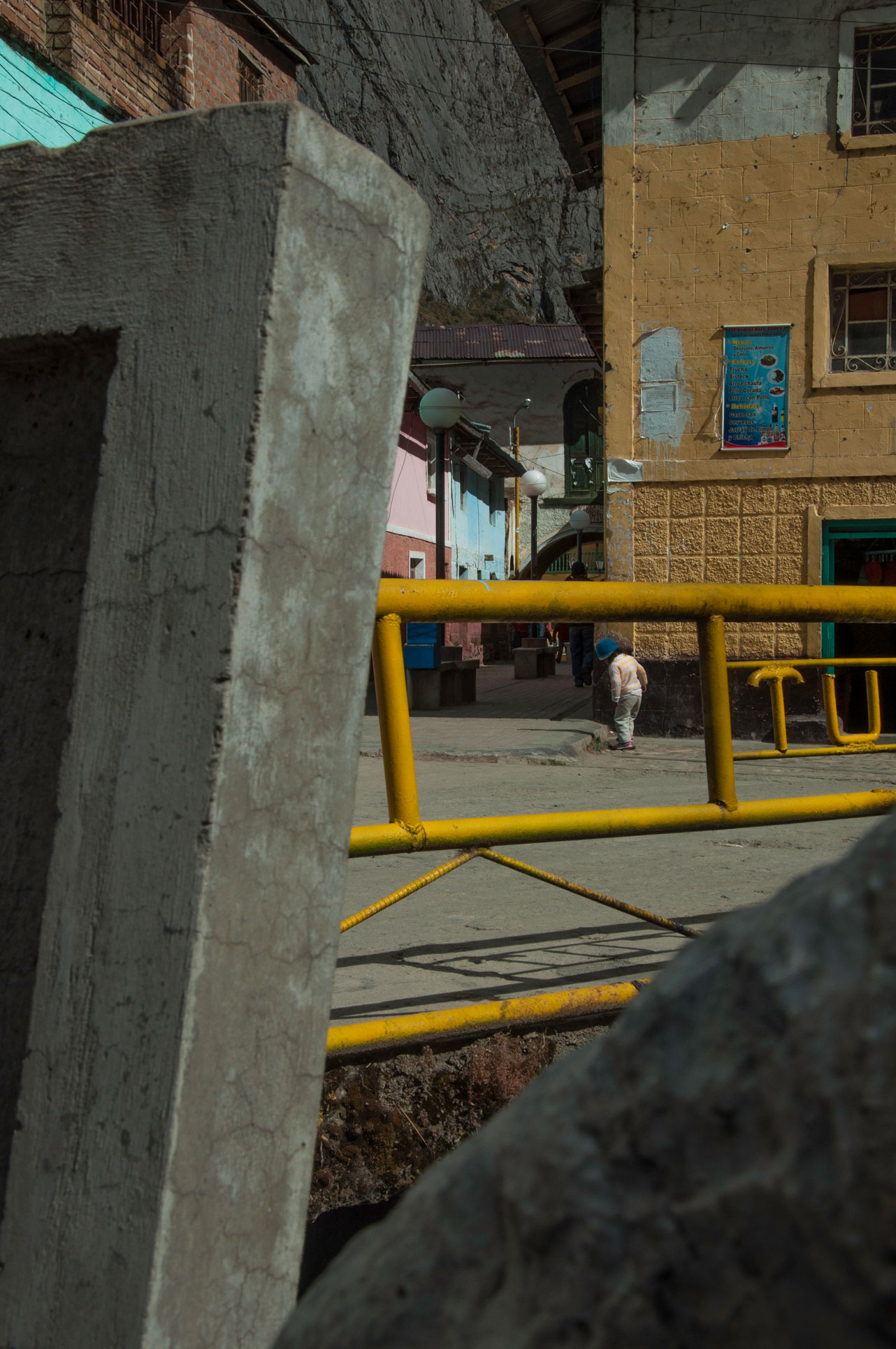 Foto 4. Niña juega y vive en un pequeño acertijo hecho de concreto y sueños. (2015) Lugar: Tómas. Reseña: La naturaleza es una constante proyección. La naturaleza nos hace y por lo tanto la somos, hacemos arquitecturas y las arquitecturas nos hacen. Lo interno es externo y viceversa. Pimer plano: elementos urbanos. Segundo Plano: niña en el diario colorido de la calle. Tercer Plano: Montaña | | Foto 5. El tiempo no existe, pero la luz y la sombra. Cada ser, cada parte por más ínfima que sea, es una referencia, un centro. (2015) Lugar: Tómas. Reseña: La sombra, el día, se inclinan sobre un joven, proyectando algunas formas que solo encontramos en urbanizaciones. Primer y Segundo Plano: puente y muro de una vivienda, un ser, una calle que se pierde. | |