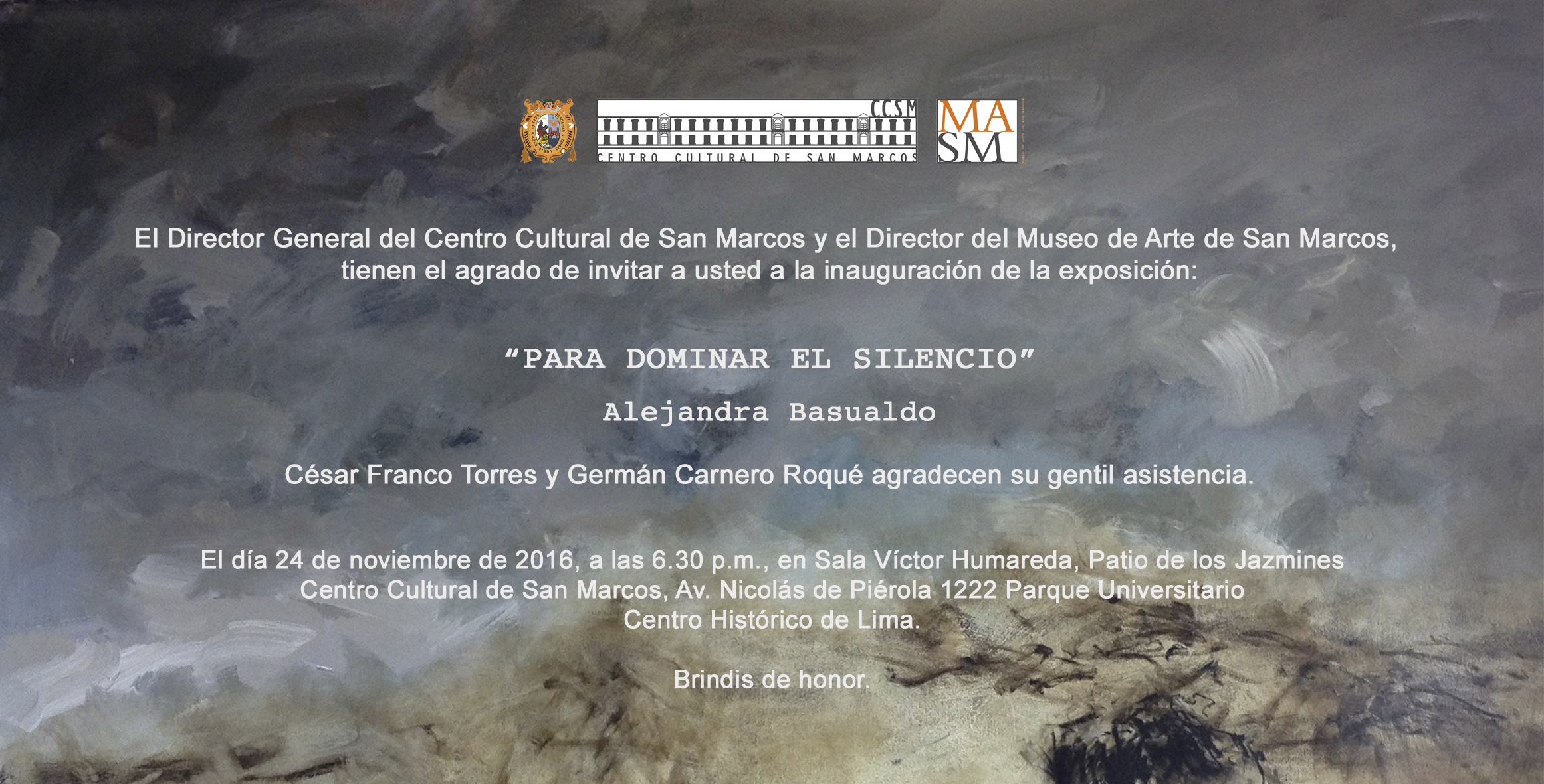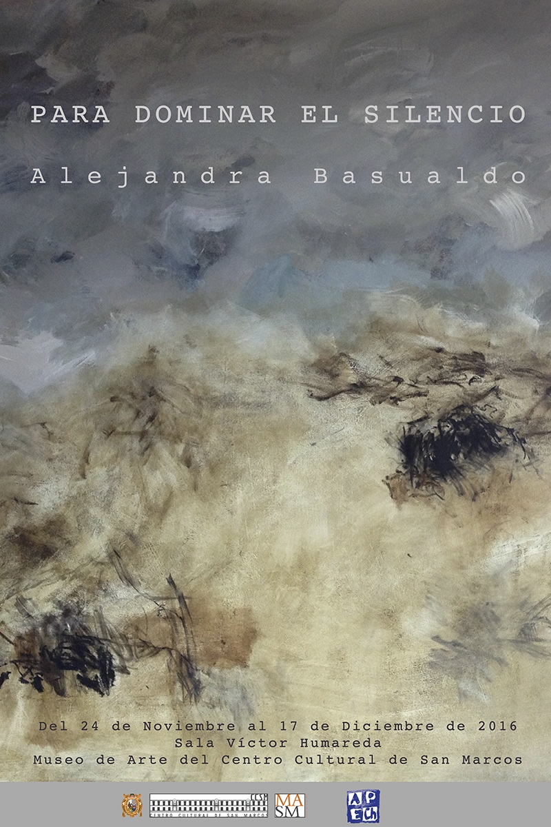 El Museo de Arte de San Marcos (MASM) culmina su programa de exposiciones del año 2016 con la participación de la artista chilena Alejandra Basualdo, quien nos presenta una selección de obras pertenecientes a su producción más actual, titulada Para dominar el silencio. Alejandra es licenciada en Artes Plásticas con mención en Pintura y Pedagogía Media en Artes Plásticas por la Universidad Finis Térrea de Santiago de Chile, además cuenta con estudios de grabado realizados en la Unión de Escritores y Artistas de La Habana, Cuba. La exposición va del 24 de noviembre al 17 de diciembre de 2016 en el Museo de Arte de San Marcos, Av. Nicolás de Piérola 1222, Parque Universitario, Centro Histórico de Lima.