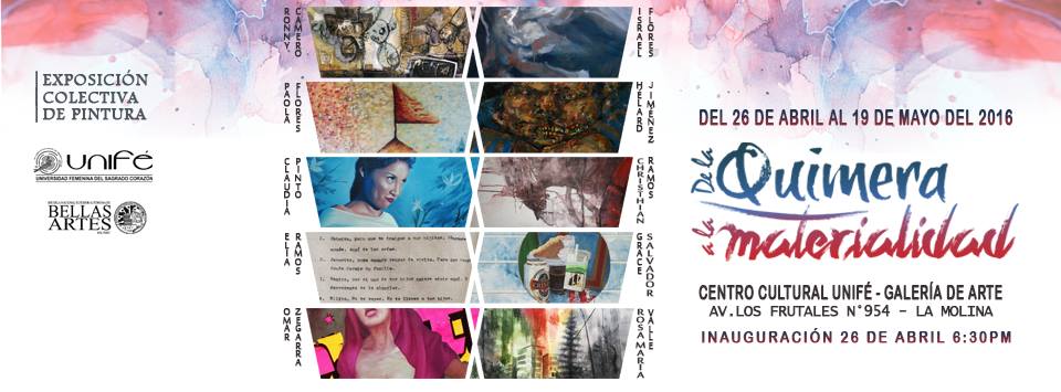 "De la Quimera a la Materialidad", es el título de la muestra colectiva que presentan los artistas Rony Camero, Israel Flores, Paola Flores, Hélard Jiménez, Claudia Pinto, Christhian Ramos, Elia Ramos, Grace Salvador, Rosa María Valle y Omar Zegarra, egresados de la Promoción de Pintura 2015 de la ENSABAP, en la Galeria de Arte del Centro Cultural de la UNIFE.