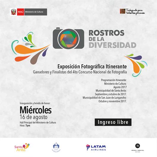En el marco del día de la Fotografía se realizará la Exposición Fotográfica Itinerante "Rostros de la Diversidad" el día 16 de agosto a las 7 p.m. en el Hall del Ministerio de Cultura, en la cual se dará la inauguración de la exposición de las fotografías ganadoras y finalistas del 4to Concurso Nacional de Fotografía 2016 del Ministerio de Cultura del Perú.