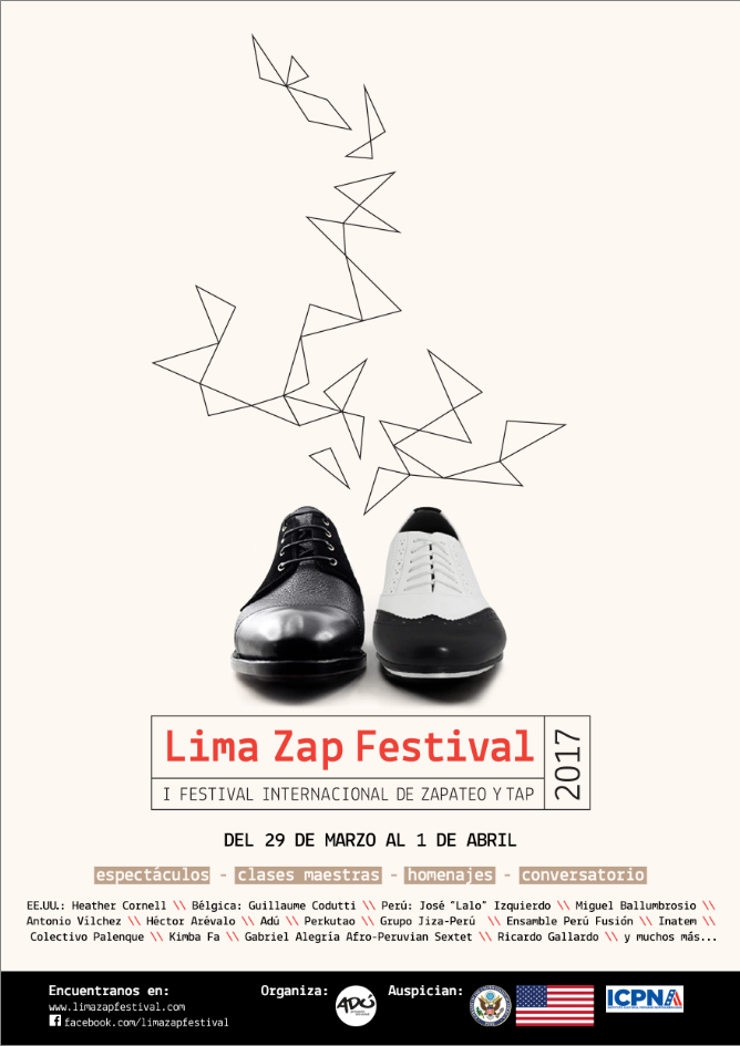 Del 29 de marzo al 1 de abril se realizara en la ciudad de Lima el LIMA ZAP FESTIVAL que es el primer festival internacional de zapateo y tap que se realiza en el Perú organizado por la Asociación cultural Adú Proyecto Universal que dirige el zapateador peruano Antonio Vilchez con el auspicio de la Embajada de Estados Unidos y el apoyo del ICPNA (Instituto Cultural Peruano Norteamericano) además del gran apoyo de la comunidad de artistas-zapateadores-