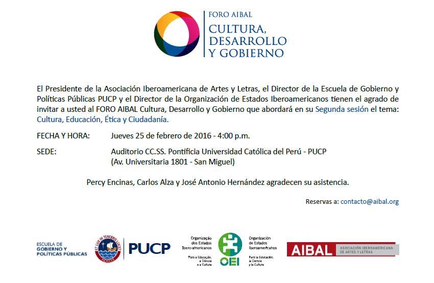 El FORO AIBAL Cultura, Desarrollo y Gobierno está organizando su segunda sesión para debatir sobre la importancia de la Cultura en la agenda del próximo gobierno con el tema de : "Cultura, Educación, Ética y Ciudadanía". Éste se realizará este jueves 25 de febrero de 2016 a las 4:00 pm en el auditorio CC. SS. de la Pontificia Universidad Católica del Perú. Asimismo, el foro será transmitido en vivo a través de Cultura24.tv