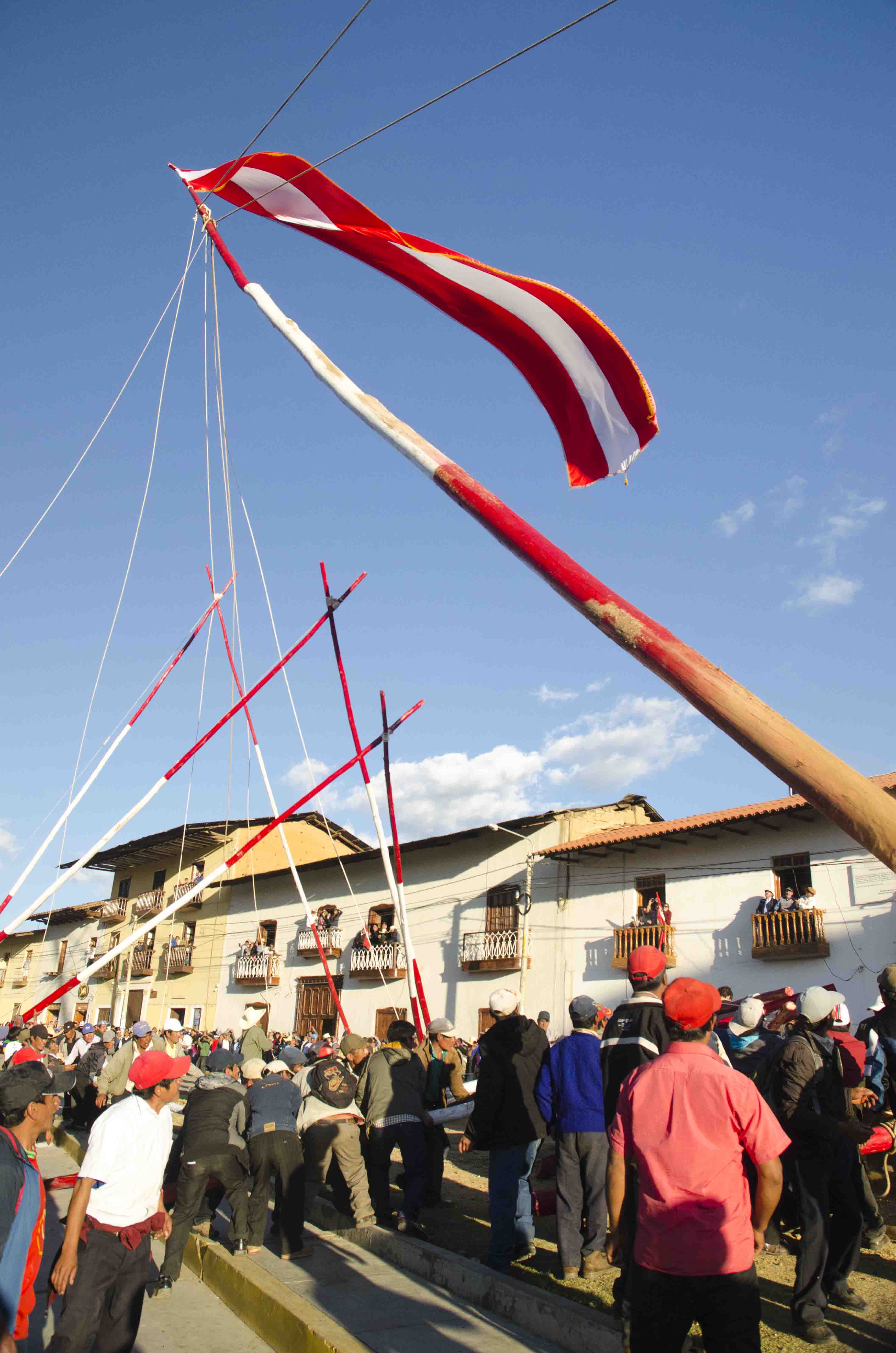 Foto 4: La técnica- Las tijeras conforman el primer y mayor impulso de este proceso, después el tronco es jalado con sogas para completar su posición vertical | | Foto 5: El cielo y la tierra- Las sogas también se encargan de enderezar al gallardete, creando correteos en la plaza, buscando el ángulo ideal para ellos | |