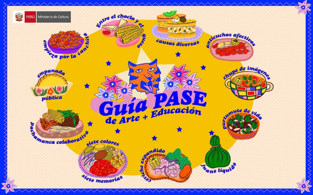 En el marco del Programa de Artes en la Escuela - PASE se ha diseñado la Guía PASE de Arte + Educación, material didáctico, que busca motivar la reflexión y fortalecer la práctica docente en arte y cultura. De esa manera la Guía se presenta como un menú de herramientas, a manera de platos típicos peruanos. Así, el docente podrá acceder a contenidos como “pachamanca colaborativa”, “ceviche expandido”, “juane líquido”, “anticuchos afectivos”, entre otros. Cada plato le ofrecerá temas, ejercicios, videos, y otras referencias, a través de los cuales cada docente irá profundizando en los contenidos y herramientas didácticas que más le interesen.