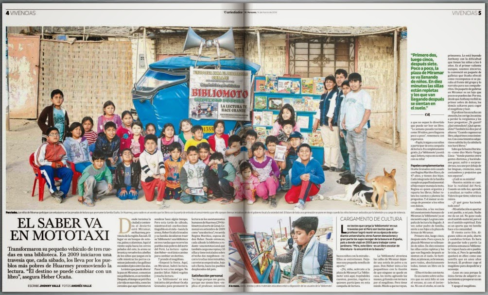 La Bibliomoto es una idea original de Heber Ocaña que viene siendo comentada y felicitada desde diversas plataformas culturales. Voces globales, en su versión en español, dentro de la publicación “Bibliotecas móviles del mundo”, dice: «En Perú, la biblioteca móvil ha evolucionado a biblioteca en motocicleta. Como parte del Proyecto Futura, la Biblioteca Comunitaria Obraje también lleva libros a los niños de otras comunidades, como parte de las actividades culturales y literarias que organizan».