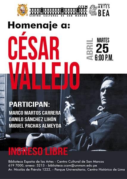 HOMENAJE A CÉSAR VALLEJO. MARTES 25 DE ABRIL, CENTRO CULTURAL SAN MARCOS. INGRESO LIBRE.