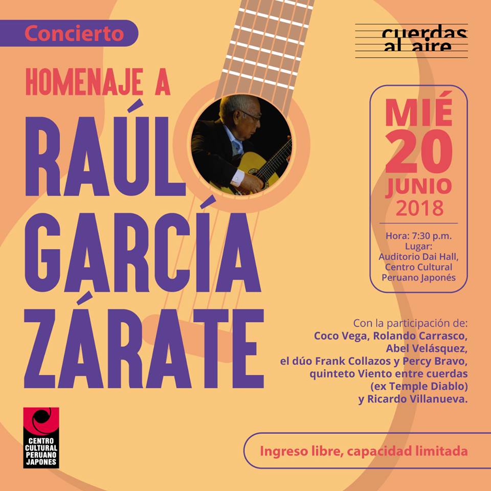 A ocho meses de la partida del maestro Raúl García Zárate, figura mayor de la guitarra en el Perú, se realizará este homenaje que contará con la participación de los destacados maestros Coco Vega, Rolando Carrasco, Abel Velásquez, Ricardo Villanueva, el dúo Frank Collazos y Percy Bravo, quinteto Viento entre cuerdas (ex Temple Diablo), todos ellos discípulos y amigos del maestro García Zárate, le rinden un sentido homenaje, interpretando sus obras y arreglos, además de piezas del amplio repertorio guitarrístico andino.