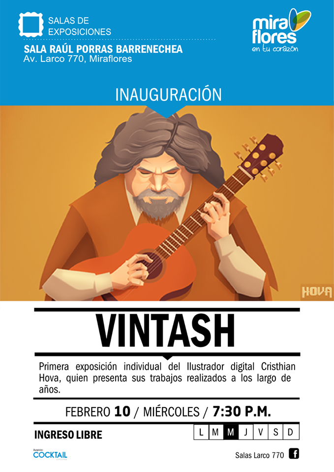 Cristhian Hova, ilustrador digital de la escena artística actual presenta su primera exposición individual titulada "Vintash" en la Sala Raúl Porras Barrenechea ubicada en el Centro Cultural Ricardo Palma del 10 al 28 de febrero