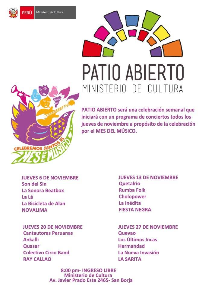 El Ministerio de Cultura continúa, este jueves 13 de noviembre, la celebración ‘Patio Abierto’ por el Mes del Músico, con el concierto de cuatro nuevas bandas y el fin de fiesta a cargo del grupo de música afroperuana contemporánea, Fiesta Negra.