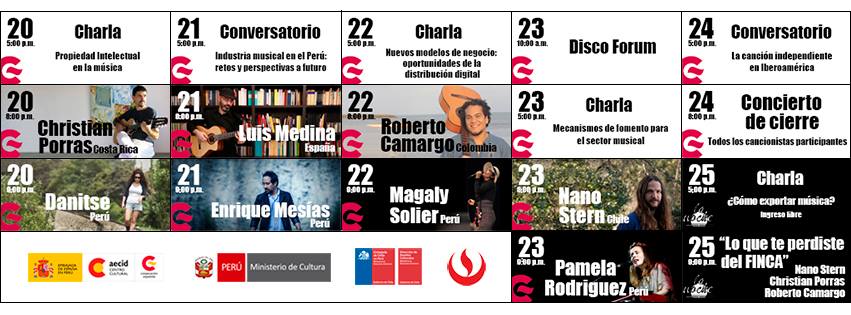 Como parte de las actividades programadas, se encuentran las presentaciones de reconocidos artistas de nuestro país y de Iberoamérica, como Danitse, Magaly Solier, Pamela Rodríguez, Enrique Mesías, Nano Stern (Chile), Christian Porras (Costa Rica), Roberto Camargo (Colombia), y Luis Medina (España).