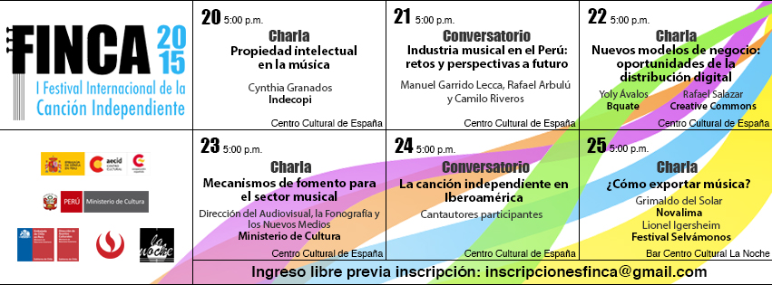 Además, el FINCA – 2015 incluirá charlas y conservatorios con diversos especialistas en temáticas relevantes para la reflexión y fortalecimiento de artistas peruanos. Las instituciones participantes son el Indecopi, Creative Commons Perú, Bquate y el Ministerio de Cultura mediante la Dirección del Audiovisual, la Fonografía y los Nuevos Medios. Asimismo, se contará con la presencia de los destacados productores musicales peruanos Rafael Arbulú y Manuel Garrido Lecca; el músico, antropólogo y gestor cultural Camilos Riveros, Gerente General de Cohete Lab y Espiral Music Network; Grimaldo del Solar, integrante de la banda Novalima; y Lionel Igersheim del Festival Selvámonos. A continuación, se detalla la programación: