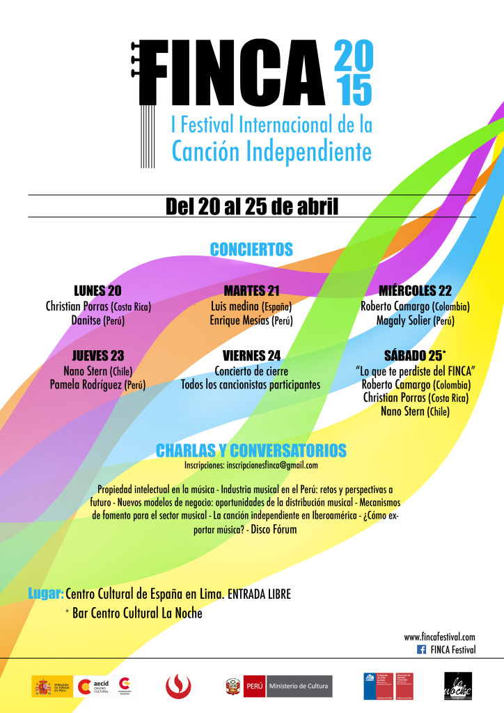 Del 20 al 25 de abril, el Centro Cultural España y La Noche de Barranco alojarán la primera edición del Festival Internacional de la Canción Independiente FINCA – 2015, iniciativa que busca difundir las propuestas musicales de artistas nacionales e internacionales independientes mediante conciertos; fortalecer las capacidades de la industria musical independiente mediante charlas y conversatorios gratuitos; y generar sinergias entre los distintos actores de la canción independiente nacional e internacional.