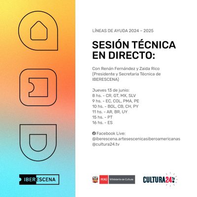 El pasado 28 de mayo se abrió oficialmente la Plataforma para envío de proyectos a la Convocatoria 2024-2025 y, como viene siendo habitual en los últimos años, el próximo 13 de junio el Presidente, Renán Fernández, y la Secretaría Técnica de IBERESCENA, Zaida Rico, realizarán una sesión técnica en la que se explicarán los principales requisitos de las bases de las tres Líneas de Ayuda (Creación, Coproducción y Programación) y se completará, a modo de ejemplo aclaratorio, una solicitud en la Plataforma del Programa.