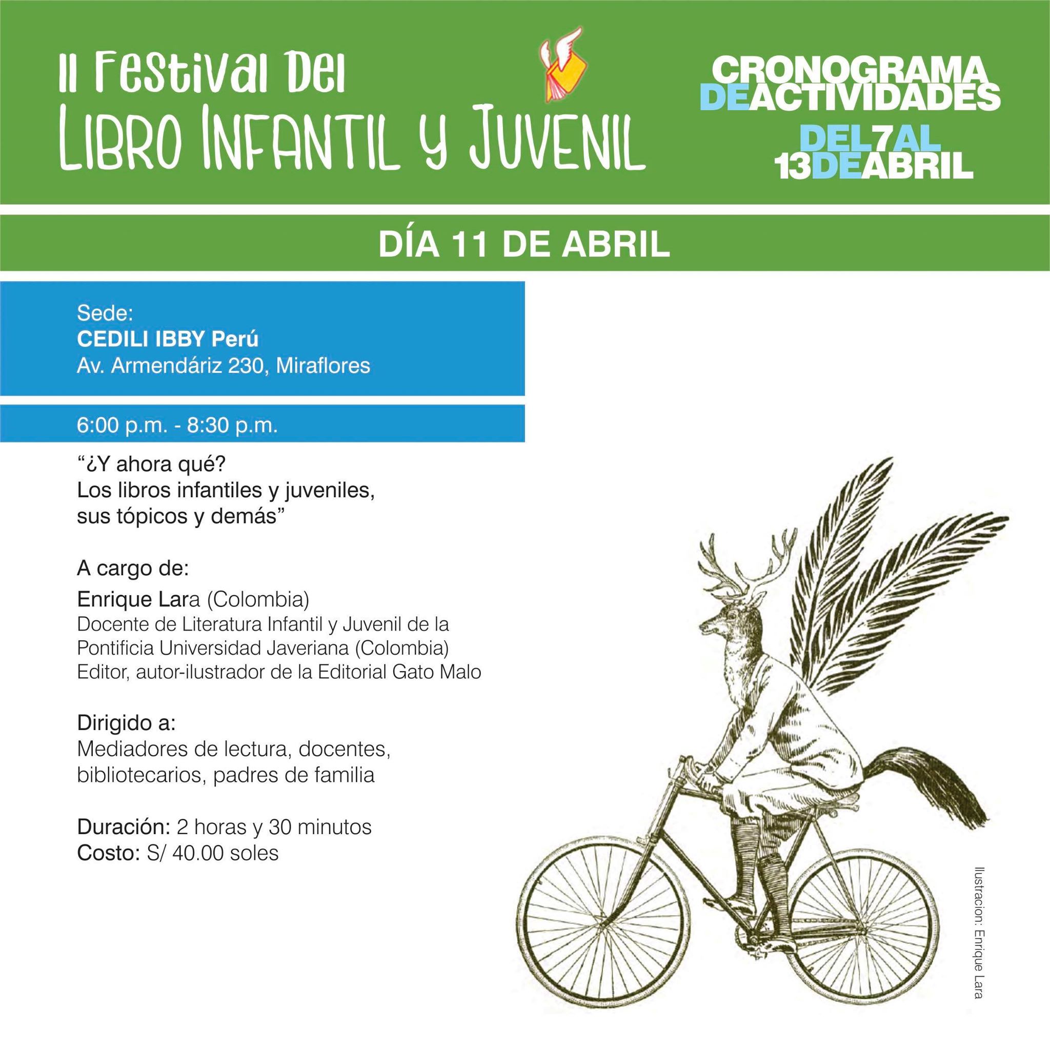 En el marco del Día Mundial del Libro Infantil y Juvenil, del 9 al 13 de abril, el Centro de Documentación e Información de Literatura Infantil (Cedili Ibby Perú), realizará el II Festival del Libro Infantil y Juvenil, evento que cuenta con la participación de destacados editores, escritores, ilustradores internacionales y nacionales, quienes ofrecerán talleres, mesas de diálogo, entre otras actividades diversos puntos de la ciudad de Lima.