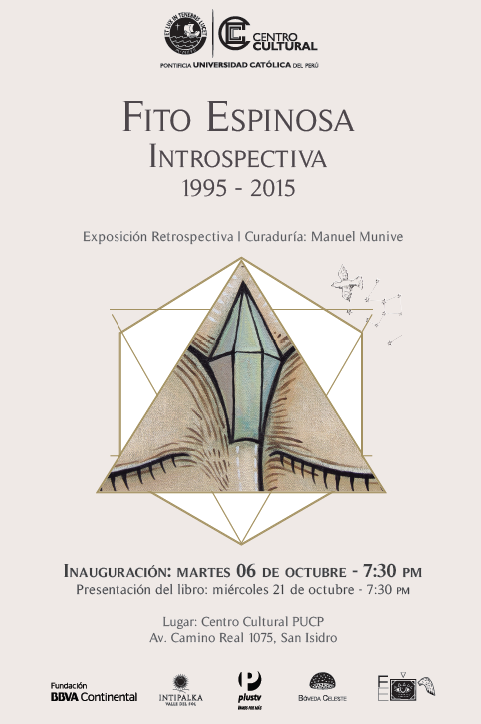 Por los 20 años de la destacada labor artística de Fito Espinosa, el Centro Cultural de la Pontificia Universidad Católica del Perú se complace en presentar, junto a la Fundación BBVA Continental, la exposición INTROSPECTIVA, FITO ESPINOSA 20 AÑOS | 1995-2015, muestra que reúne un total de cuarenta y cinco lienzos de diferentes épocas y colecciones privadas, así como cuadernos de bocetos y dibujos originales a manera de retrospectiva, bajo la curaduría de Manuel Munive. Desde este martes 6 de octubre a las 7:30 p.m. en la Galería del Centro Cultural PUCP, podremos apreciar la obra de Fito Espinosa, cuyo trabajo se ha hecho merecedor de numerosos premios y reconocimientos a lo largo de los años. ¡Estas invitado!