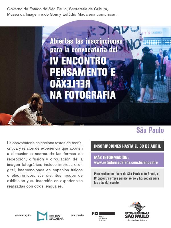 El Estudio Madalena (Sao Paulo) les invita a participar del IV Encuentro Pensamiento y Reflexión en la Fotografía que acontecerá en el MIS (Museu da Imagem e do Som de São Paulo, Brasil) los días, 28, 29 y 30 de mayo, y que nuevamente convoca a investigadores y teóricos para presentar los resultados de sus proyectos de investigación.