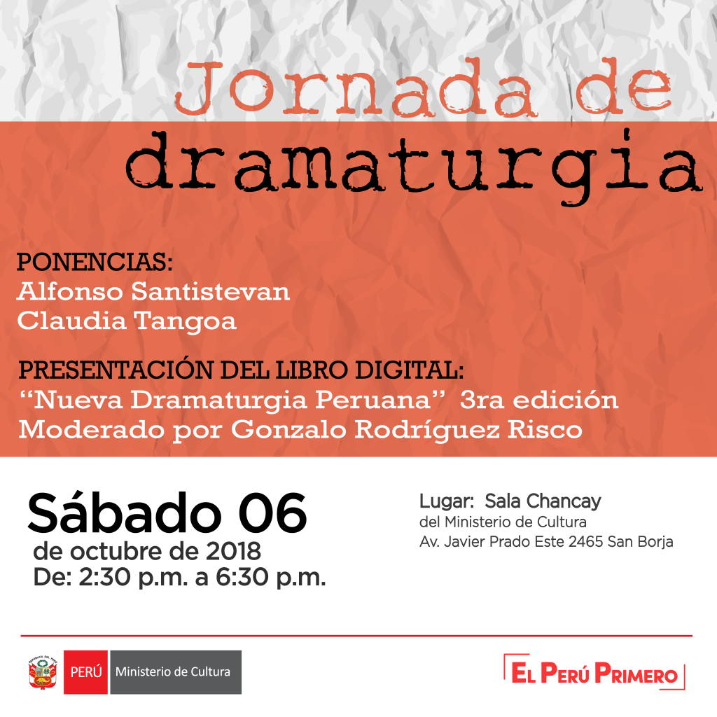 El día sábado 06 de octubre se realizará la Jornada de Dramaturgia, la cual contará con dos ponencias que girarán alrededor del tema: “El dramaturgo como promotor de sus propias obras”, y estarán a cargo del dramaturgo, actor, director y docente de teatro, Alfonso Santistevan y de Claudia Tangoa, directora, dramaturga, docente y productora escénica. Además, se realizará la presentación del libro digital “Nueva Dramaturgia Peruana”, que contiene las obras ganadoras de la 3era edición del Concurso “Nueva Dramaturgia Peruana”. Asimismo, se llevará a cabo un conversatorio con los autores de las obras, el cual será moderado por Gonzalo Rodríguez Risco, dramaturgo, guionista y traductor peruano, quien además asesoró el proceso de revisión de los textos, antes de su publicación.
