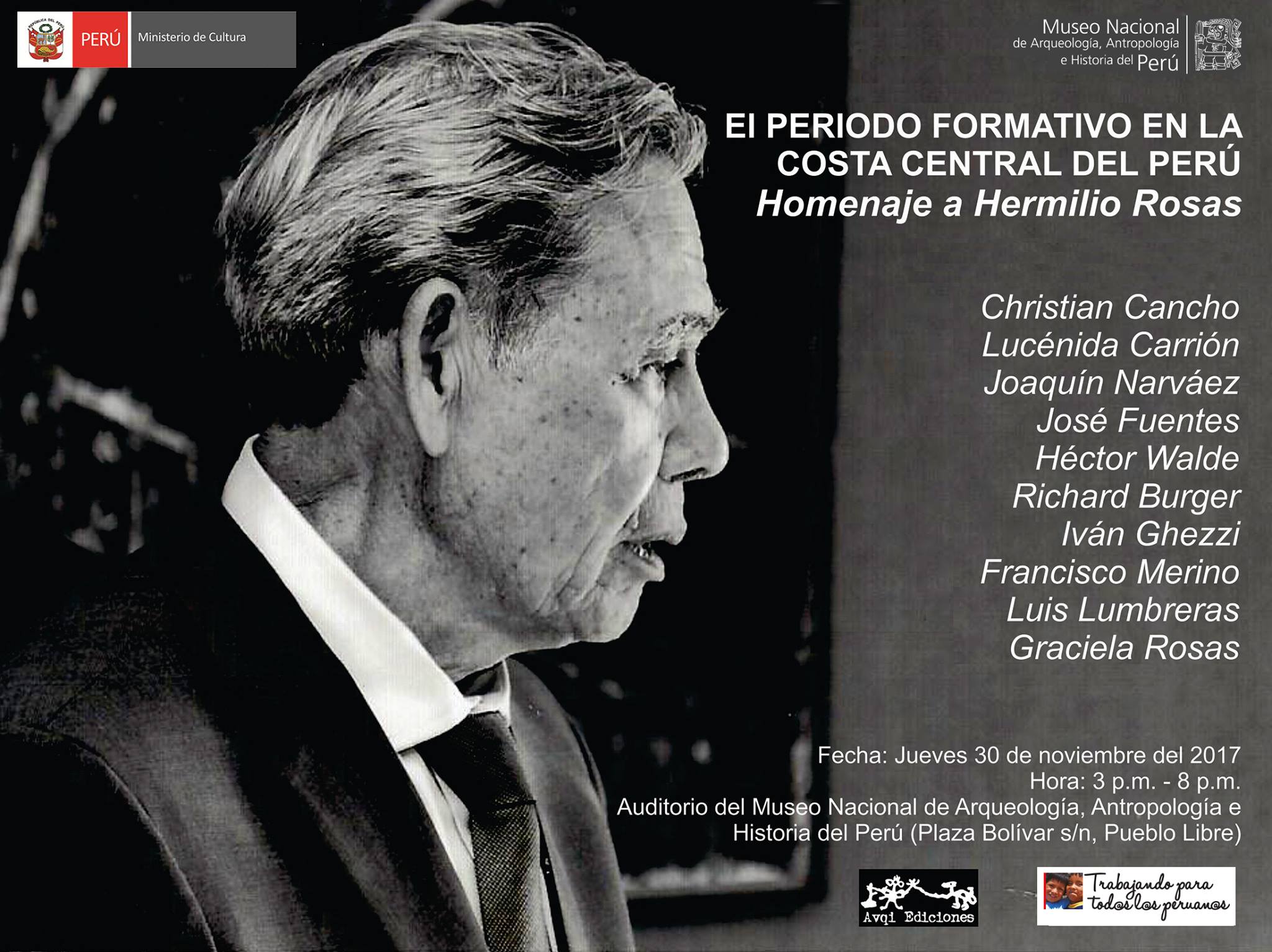 En este año partió uno de los anteriores directores del Museo Nacional de Arqueología, Antropología e Historia del Perú, el arqueólogo Hermilio Rosas La Noire, cuyos trabajos de investigación contribuyeron con los estudios en el periodo Formativo en la arqueología peruana; por ello, este jueves 30 de noviembre, desde las 3:00 p.m. se rendirá un homenaje  a su legado con un ciclo de conferencias. La entrada es libre.