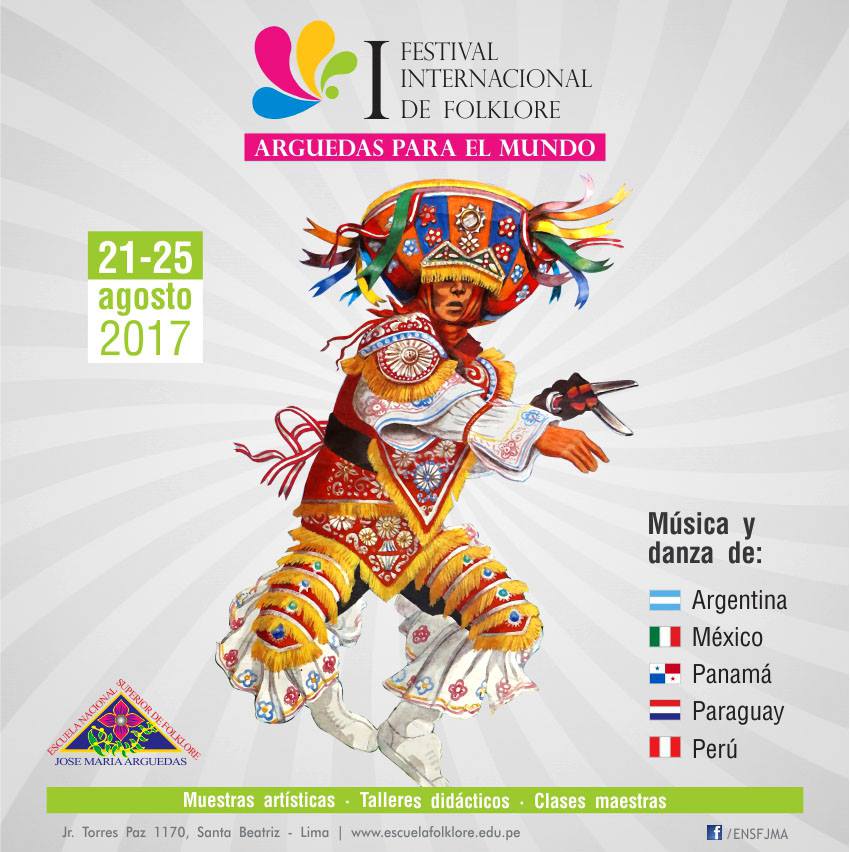 Con el objetivo de hermanar a los países de América a través de su identidad artística y cultural, la ENSF (Escuela Nacional Superior de Folklore) José María Arguedas llevará a cabo el I Festival Internacional de Folklore “Arguedas para el mundo 2017″, del 21 al 25 de agosto en la sede de la Escuela, en diversos auditorios y centros educativos de Lima.