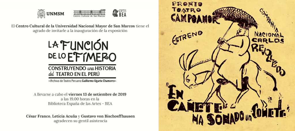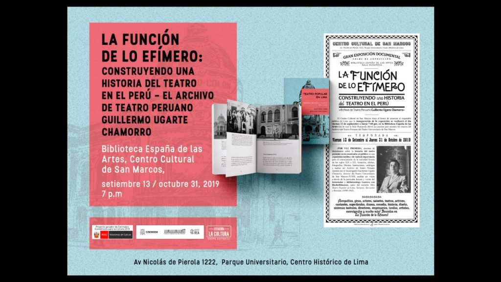 Se viene presentando en La Biblioteca España de las Artes del Centro Cultural de San Marcos desde el viernes 13 de setiembre desde las 7:00 p.m. la exposición: La función de lo efímero: Construyendo una historia del teatro peruano – El Archivo de Teatro Peruano Guillermo Ugarte Chamorro. En la Sala Víctor Humareda del Centro Cultural de San Marcos, Av. Nicolás de Piérola 1222, Parque Universitario, Centro Histórico de Lima y se mantendrá hasta el jueves 31 de octubre.