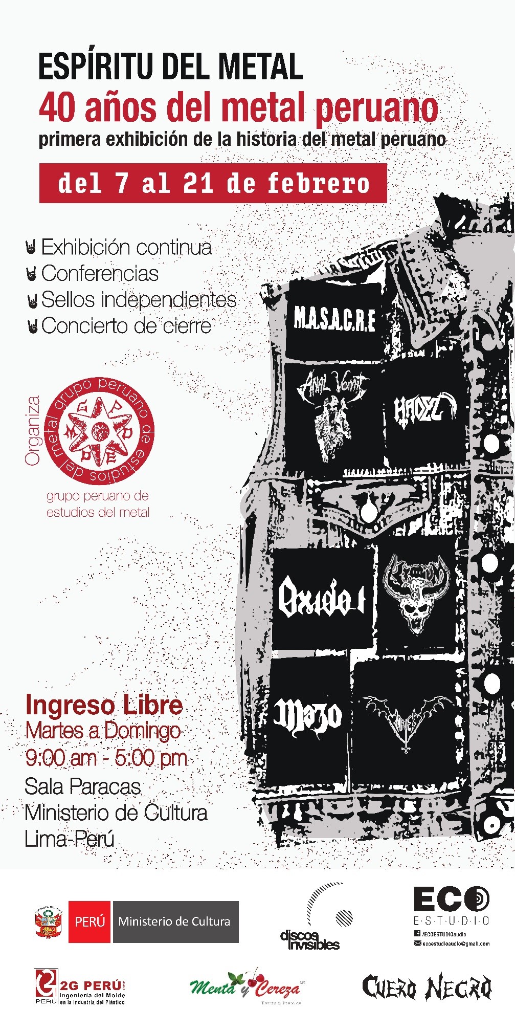 Gracias al esfuerzo del reciente Grupo Peruano de Estudios del Metal, a cargo del investigador y musicólogo José Ignacio López Ramírez-Gastón, la primera exhibición sobre a historia del metal peruano “Espíritu del Metal: 40 años del metal peruano” se va a llevar a cabo desde este viernes 7 a las 5:00 pm en la Sala Paracas de Ministerio de Cultura del Perú con el objetivo de visibilizar las 4 décadas que lo conforman.