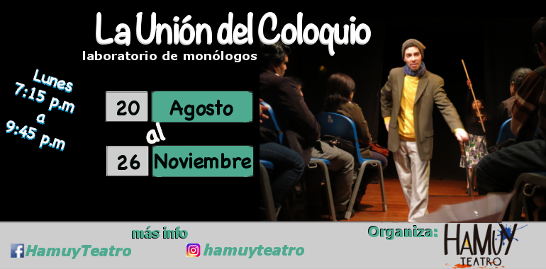 En esta oportunidad, Hamuy Teatro presenta el laboratorio de monólogos "La unión del coloquio" a realizarse del 20 de agosto al 26 de noviembre.Este taller es dirigido por la dirigido por la directora teatral Cynthia Dávila Valverde. Al finalizar, se realizará una muestra abierta al público.
