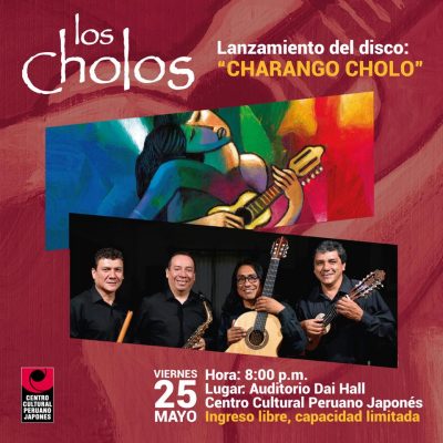 La agrupación Los Cholos presenta hoy su nueva producción musical titulada "Charango Cholo" en el Centro Cultural Peruano Japonés desde las 20:00h. Charango Cholo contiene contiene un repertorio indígena y mestizo del Perú, resultado de una profunda investigación a lo largo de varias regiones y que presenta un aporte al patrimonio cultural del país, pues además de ser un disco para el disfrute, es también una guía destinada a la enseñanza del charango peruano.