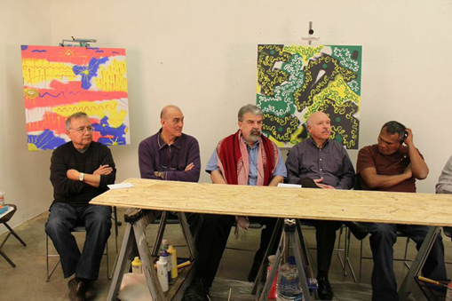 Taller de David Feinberg: proyecto interdisciplinario de arte y teatro. Marzo, 2015. De izquierda a derecha: Luis Ramos García, Pepe Bablé (Director del FIT de Cadiz), Ernesto Silva (Profesor y promotor teatral peruano en Atlanta, Georgia, Eduardo Cabrera (Dramaturgo y director de teatro argentino) y Fredy Frisancho (Los Audaces)
