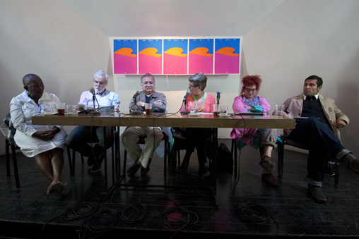 Comité para el premio teatral de la Casa de las Américas 2016. De izquierda a derecha: Fátima Patterson (Cuba); André Carreira (Brasil); Luis Ramos-García; Vivian Martínez Tabares (Directora de CONJUNTO de la Casa de las Américas; Mariana Percovich (Uruguay); y Alejandro Román (México)