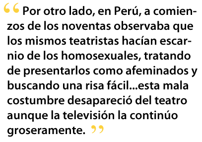 Por otro lado, en Perú, a comienzos de los noventas observaba que los mismos teatristas hacían escarnio de los homosexuales, tratando de presentarlos como afeminados y buscando una risa fácil: igual hacían con los personajes indígenas, de quienes se burlaban por sus modos de hablar. Felizmente, esto se arregló cuando los grandes grupos peruanos empezaron a darle fuerza a su conexión con el pasado indígena. Así, esta mala costumbre desapareció del teatro aunque la televisión la continúo groseramente.