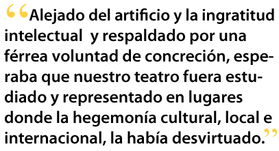 Dado el compromiso internacional, nacional y comunitario de mi universidad, mantengo activas otras líneas de investigación y publicaciones teatrales con el FIT de Cádiz (Pepe Bablé); con la Casa de las Américas (Vivián Martínez Tabares, Revista Conjunto, La Habana-Cuba), con Paso de gato (Jaime Chabaud, México) y con los del Grupo Ateatro (Juan Pablo Ricaurte, Medellín). Quizás uno de los aciertos claves de este compromiso internacional es el rigor académico que gobierna el programa de publicaciones, sujetado siempre al arbitraje y a las sugerencias de colegas de dentro y fuera de la institución. En Minnesota se preparan ediciones críticas y anotadas; es decir, todas incluyen un extenso estudio analítico, con notas al pie de página, manifiestos y bibliografías actualizadas. Son así cuidadosos trabajos doctos que, en su especificidad, continúan la tradicional orientación socio-analítica de esta universidad, explorando teorías y movimientos que incrementan el debate sobre el discurso iberoamericano teatral contemporáneo. Como herederos de una rica tradición impresora, desde la multilingüe Ideologies and Literatures –que revolucionó los estudios literarios en los Estados Unidos y de la que fui editor por dos años—hasta las publicaciones de Hispanic Issues, serie que publica sus libros impresos en inglés, The State of Iberoamerican Studies Series, ha tenido un control de calidad estructurado por la larga experiencia editorial de Nelsy Echávez-Solano, cuya participación en los tres proyectos minesotanos ha sido crucial. Se podría decir que en un comienzo hubo alguna crítica ante este tipo de publicaciones académicas, tal vez porque los teatristas peruanos preferían un manual de acción a un discurso retórico y/o porque los grupos nacionales confiaban más en la crítica extranjera (y menos en la de un peruano expatriado), ofreciendo legitimidad y apoyo a lo que se identifica en la profesión como “la presencia de depredadores intelectuales foráneos,” que por uno u otro motivo llegaban al Perú a hacer sus carreras. Sin embargo, la acogida internacional a estas impecables ediciones peruano-minesotanas, con un serio aparato investigador, hizo posible que los colegas entendieran el propósito que emanaba desde esta universidad, uno de los más activos núcleos de investigación teatral iberoamericana de los Estados Unidos. No obstante, el reconocimiento por este tipo de trabajo en pro del teatro peruano, llegó más bien desde el circuito internacional (Miami, Cádiz, Kansas), y no se hizo patente hasta el 2009 cuando la Asociación Cultural Yawar (dirigida por Tomás Temoche) organizara un emotivo homenaje público en La Balanza (Lima); luego el 2011 cuando Cuatrotablas, la Universidad de San Marcos y la Municipalidad de Lima se unieran para ofrecerme un reconocimiento por mis aportes al teatro peruano y cuando el 2015 la Municipalidad Provincial de Arequipa y el Ministerio de Cultura en Arequipa auspiciaran Una montaña en el horizonte, dando reconocimiento a mi trabajo por el teatro peruano y el latinoamericano.