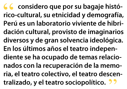 En cuanto a los temas, considero que por su bagaje histórico-cultural, su etnicidad y demografía, Perú es un laboratorio viviente de hibridación cultural, provisto de imaginarios diversos y de gran solvencia ideológica. En los últimos años el teatro independiente se ha ocupado de temas relacionados con la recuperación de la memoria, el teatro colectivo, el teatro descentralizado, y el teatro sociopolítico. En eso hemos sido un teatro postmoderno y vanguardista, con excelentes colectivos teatrales dedicados a utilizar una información interdisciplinaria para elaborar sus paradigmas. Sin embargo, pienso que luego del advenimiento del neoliberalismo y la globalización, el teatro peruano ha entrado en la absorción de nuevas formas de práctica cultural basadas en el capital humano que se ha ido formando en los asentamientos humanos y en lo que se reconoce sociológicamente como tribus urbanas. El hecho que estemos en un periodo post-traumático no es un obstáculo en sí, pero requiere un conocimiento de lo cotidiano que frecuentemente escapa a los que nos toca vivir fuera del Perú y que, por obvias razones, escapa a la mirada extranjera. Por eso mismo necesitamos de investigadores y críticos nacionales que eleven el discurso teatral de la anécdota al análisis concienzudo de nuestras posibilidades artísticas. Todos lloran todavía la partida de Hugo Salazar del Alcázar, pero hasta el momento han aparecido muy pocos investigadores que desde el Perú o desde el extranjero continúen con la tarea de llevar al teatro peruano hacia los núcleos de la comunidad internacional.