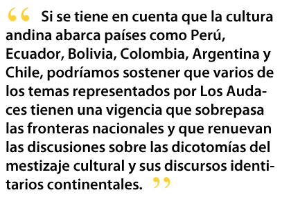 Más allá de la re-escritura de la historia de las culturas subordinadas, Los Audaces desarrollan una nueva dramaturgia verbal y corporal donde se privilegia el juego lúdico de relaciones, el uso del simbolismo, la tradición judeocristiana y los mitos fundacionales de las gestas andinas. Para ellos el “gran público” está en los espacios abiertos, en la calle, en las masas transeúntes, en el hombre común y corriente vuelto ahora en protagonista de su propio momento histórico. En ello Los Audaces han sido ejemplo y puntas de lanza de una campaña de descentralización que, desde Voces del interior: Nueva Dramaturgia peruana, y la dirección de Ruth Escudero (Teatro Nacional), ha cambiado holísticamente la fisonomía de una política cultural nacional que, a mi parecer, era discriminatoria y arbitraria. Una montaña en el horizonte legitima la creación y crítica teatrales desde el interior del país, conectándose temática y significativamente con los movimientos teatrales surgidos en la periferie capitalina –por ejemplo en los conos norte y sur, Comas, Villa El Salvador-- en cuanto millones de sus pobladores no solo son de extracción provinciana, sino que además continúan / practican sus tradiciones ancestrales y relatan sus historias particulares. Poco a poco, tal como lo postulara José María Arguedas, estaríamos llegando a la utópica necesidad de establecer los nuevos parámetros de una ansiada unicidad mítico-teatral que ya se nos antoja no tan distante. Esa es para mí una de las grandes contribuciones de Los Audaces al teatro peruano y al andino-continental; en mi opinión esto será lo que en el futuro ocupará la atención de los investigadores y académicos teatrales iberoamericanos.