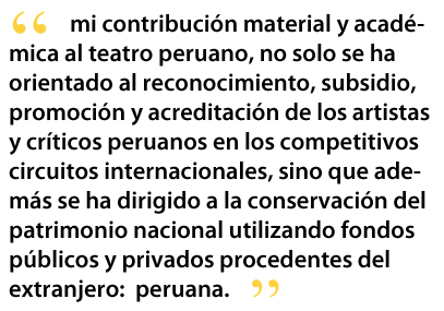 En lo que respecta a las dificultades propias de la investigación teatral, han habido sin duda algunos imponderables que dificultaron mi tarea en el Perú y que parecerían minúsculos si no fuera porque provenían de los mismos peruanos o de extranjeros de paso por el Perú. Por ejemplo, la suspicacia de siempre hacía que muchos archivos y materiales teatrales fueran inaccesibles a los investigadores nacionales ya sea porque se pensaba que uno se iba a aprovechar financieramente de los mismos o porque simplemente uno no estaba en el circuito socio-político correspondiente, v.gr. nunca tuve relaciones de trabajo con los teatros comerciales, ni con los de la burguesía peruana, ni nunca fui invitado por ellos. Paradójicamente los investigadores extranjeros (los relacionados con la academia) encuentran arca abierta y ninguna dificultad para organizar archivos y fabricar dossiers utilizados para lograr mejoras monetarias y reconocimiento académico en sus países de origen. Se hace asombroso que una vez fuera del Perú, mostrando una falta de profesionalidad, estos extranjeros no citen en sus ensayos y libros las fuentes peruanas de donde extrajeron su información, no se ven acotaciones de la introducción que escribí a Notas sobre teatro entre varios “especialistas extranjeros del teatro peruano.” Esto es insólito si tomamos en cuenta que ese libro se discute en la academia teatral y que recibió notables reseñas internacionales desde el 2001 cuando se publicó. Cuando estos “peruanistas” hacen sus publicaciones (usualmente en inglés), aparecen como si ellos/ellas estuvieran “descubriendo” algo que nadie había estudiado anteriormente: nadie los llama al orden, de forma que algunos continúan en la práctica. Otra dificultad reside en la sistemática desaparición de festivales, materia prima de la investigación teatral; todos nos extrañamos cuando Percy Encinas, destacado investigador y promotor teatral limeño, dejara de organizar sus grandes festivales teatrales de la UCSUR, y fuera reemplazado por una extranjera cuya capacidad de convocación teatral era relativamente menor. En mi caso particular, aunque indirectos, estos cambios repentinos hicieron más difícil la investigación, puesto que disminuyeron las posibilidades de representación escénica y el contacto con los grupos peruanos de la periferia.