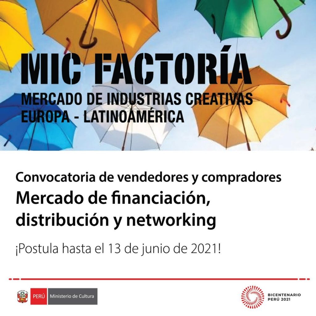 El Ministerio de Cultura del Perú, a través de la Dirección General de Industrias Culturales y Artes, anuncia la convocatoria para participar en el MIC FACTORÍA, Mercado de Industrias Creativas Europa-Latinoamérica, mercado digital y en español, que propone explorar los nuevos nichos y tendencias del mercado de las industrias culturales y creativas. Este evento, tendrá lugar los días 22, 23, y 24 de junio de 2021, a través de la plataforma KOYAG.