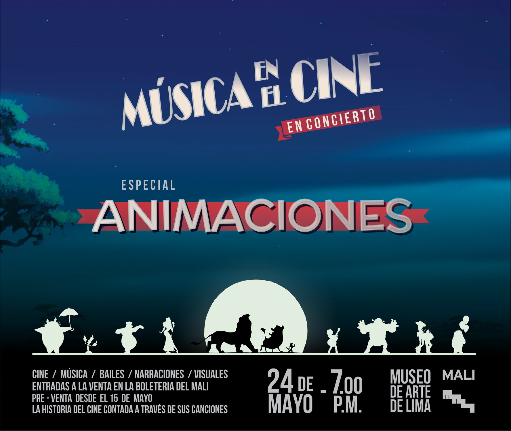Música en el cine es un espectáculo que busca dar a conocer la historia del cine a través de sus canciones, con actuaciones, narraciones, bailes y música en vivo en modernas adaptaciones. En esta ocasión se presenta una función especial dedicada al cine de animación con películas de todas las épocas. Este espectáculo estará a cargo de Jean Carlo Rivera.