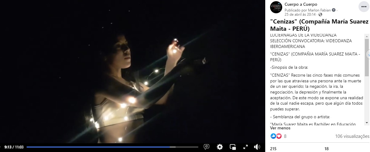 En esta edición realicé las funciones relacionadas con la línea gráfica y las exigencias de las necesidades técnicas de los medios virtuales. Mi trabajo consistió en ocuparme, de esta manera, de la producción de carteles para redes sociales y de las publicaciones de los artículos de la Muestra: Luciérnagas de la Videodanza, que fueron seleccionados por la curaduría. Esta Muestra estuvo compuesta por trabajos de artistas invitados y convocados (en esta categoría se recibió 111 propuestas de videodanza a través de nuestra convocatoria de carácter ibero americana). Luciérnagas de la Videodanza estuvo compuesta por un total de 40 obras, 6 de las cuales fueron de artistas previamente invitados por la dirección y otras 34 obras seleccionadas por los curadores, Charlotte Giusti (Francia), Augusto Navarro (Perú) y Flavio Tonnetti (Brasil), bajo la curaduría general de Carlos Cruz (México). Estas creaciones se exhibieron durante los siete días del festival y aún lucen en las plataformas digitales del Cuerpo a Cuerpo[2].