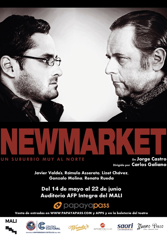 Presentamos el afiche de la obra Newmarket. Un suburbio muy al norte, que se estrena el jueves 14 de mayo en el Auditorio AFP Integra del Museo de Arte de Lima. La preventa va hasta el 13 de mayo, con precio de 15 soles para el público en general. Las entradas están a la venta en www.papayapass.com y en la boletería del MALI.